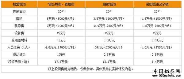 通过上表,我们可以了解到,古茗茶饮的开店费用,因为所处的城市级别不一样,整体花销也不一样。其中,省会城市、直辖市加盟需要17.8万元,地级城市加盟需要12.6万元,县级城市及乡镇加盟需要8.4万元。